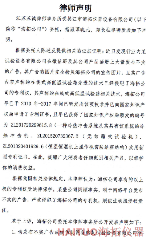 海拓儀器律師聲明:反對侵權(quán)行為 維護公司和消費者權(quán)益摘要:國內(nèi)試驗設備領先者吳江市海拓儀器設備有限公司委托律師事務所發(fā)布了律師聲明,該聲明指出,當前市面上出現(xiàn)了產(chǎn)品專利侵犯海拓儀器權(quán)益,海拓儀器將以法律手段維護自身利益。該律師聲明要求某試驗設備有限公司立即停止侵權(quán)行為,扯下其在網(wǎng)絡平臺的相關(guān)廣告和宣傳畫冊并同時停止生產(chǎn)同款設備。如果該設備公司不聽勸解,海拓儀器將向人民法院依法起訴該公司侵權(quán)行為,以維護自身合法權(quán)益和維護客戶消費權(quán)益,并建議廣大消費者仔細甄別相關(guān)產(chǎn)品。? ? ? ?近日,吳江市海拓儀器設備有限公司委托律師事務所發(fā)布了律師聲明,該聲明指出,當前市面上出現(xiàn)了產(chǎn)品專利侵犯海拓儀器權(quán)益,海拓儀器將以法律手段維護自身利益。??事件源起于海拓儀器發(fā)現(xiàn)市面上有同類設備公司通過完全拷貝海拓儀器產(chǎn)品宣傳圖片,在微信群及該公司產(chǎn)品畫冊上大量發(fā)布不實廣告。??聲明指出,該廣告聲稱的在線式高低溫試驗箱的技術(shù)侵犯了海拓儀器的專利權(quán),該產(chǎn)品專利由海拓儀器 -